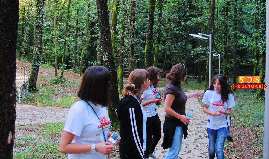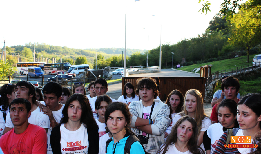 Yes, our excursion came to the end in Motsameta, where we made fairly long stop. After exploring the monastery and taking memorable shots, we sat right in the church yard and talked about Motsameta, Gelat, Bagrati… about significance of these historical monuments in the development of political and cultural life of Georgia in the old times. These churches are the outstanding samples of cultural heritage and represent immense artistic value as art memorials. That’s why their protection and care is civil responsibility of society as a whole and each of us. Particularly important role in this process is devoted to youngsters, who should remember that Motherland starts with the past, and its every expression is our treasure. We discussed the impact of the “SOS Culture” project on protection of abandoned and neglected historical monuments and bringing up in the youth respectful attitude towards the past. Our conversation has as well touched upon tolerance, friendship, time spent in Imereti and here, in the bosom of nature, came to better comprehension of mentioned topics. Afterwards was fun again: games, dances, songs and once more the feeling of being friends, being tolerant, and, most importantly, being children of this beautiful country.